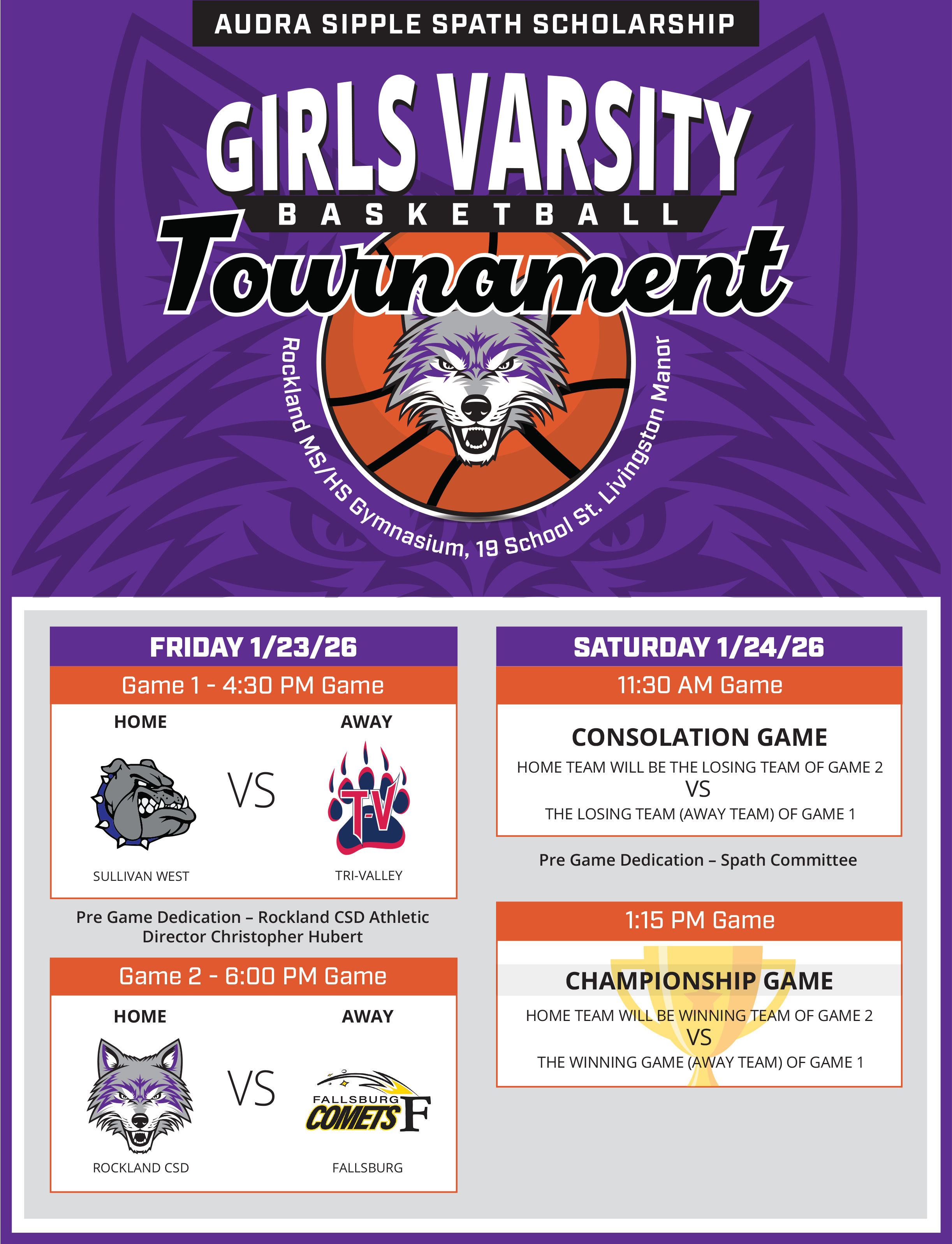 Rockland Middle/High School will host the Audra Sipple Spath Scholarship Girls Varsity Basketball Tournament later this week.The four-team tournament will kick off Friday, Jan. 23, with Sullivan W...